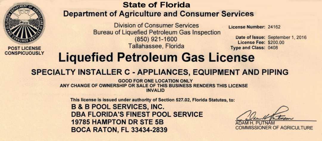 Florida's Finest Pool Service is state certified which allows us to legally repair pool equipment. In addition, our repair technicians regularly take continuing education courses to remain current and ensure the highest quality of repair work. Our repair scope also includes heaters, as we are LP 0408 licensed to repair and replace them. Most pool companies are not; having non-licensed personnel work on your heater can void your warranty.